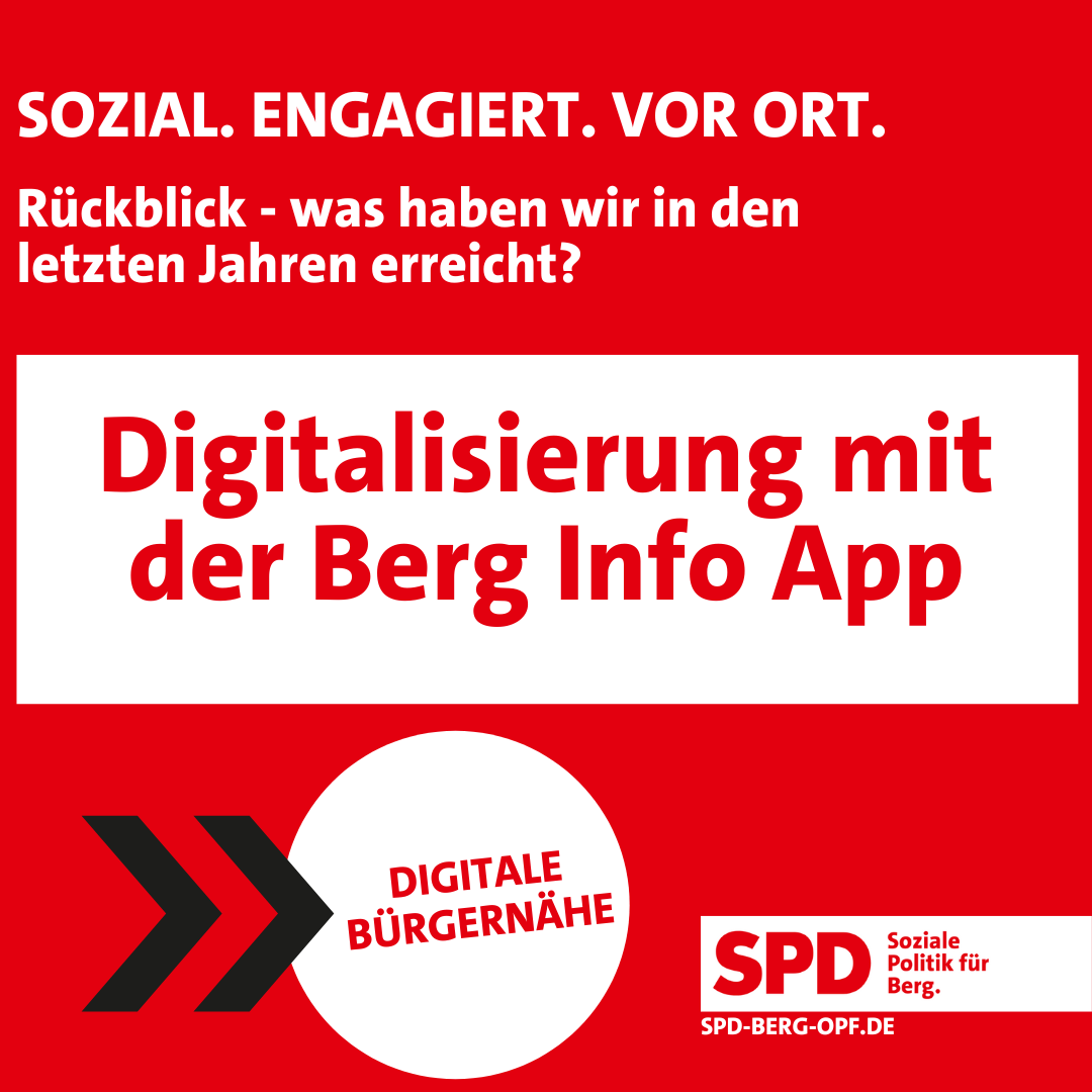 Die SPD-Fraktion hat 2023 die Einführung einer Kommunen-App zur besseren Bürgerbeteiligung beantragt. Der Gemeinderat stimmte zu, und mit der Berg Heimat App wurde die Idee erfolgreich umgesetzt. Heute ist sie ein fester Bestandteil der Kommunikation in der Gemeinde Berg.