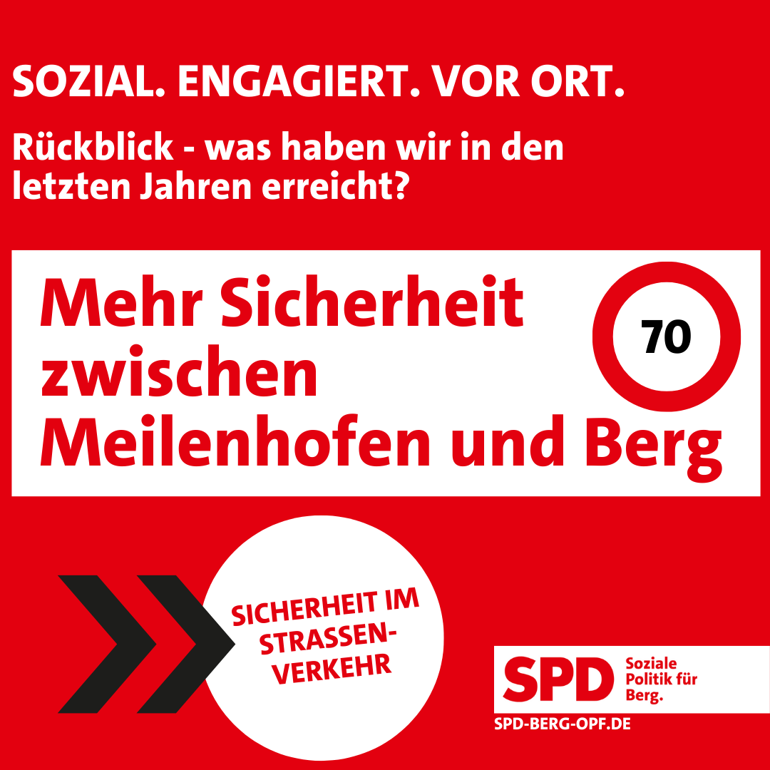 Die SPD-Fraktion hat 2024 eine einheitliche Geschwindigkeitsbegrenzung auf 70 km/h zwischen Meilenhofen und Berg beantragt. Der Gemeinderat stimmte zu, und die Maßnahme wurde unmittelbar umgesetzt. Ziel war mehr Verkehrssicherheit, weniger Lärm und ein besserer Schutz für Kinder und Jugendliche.