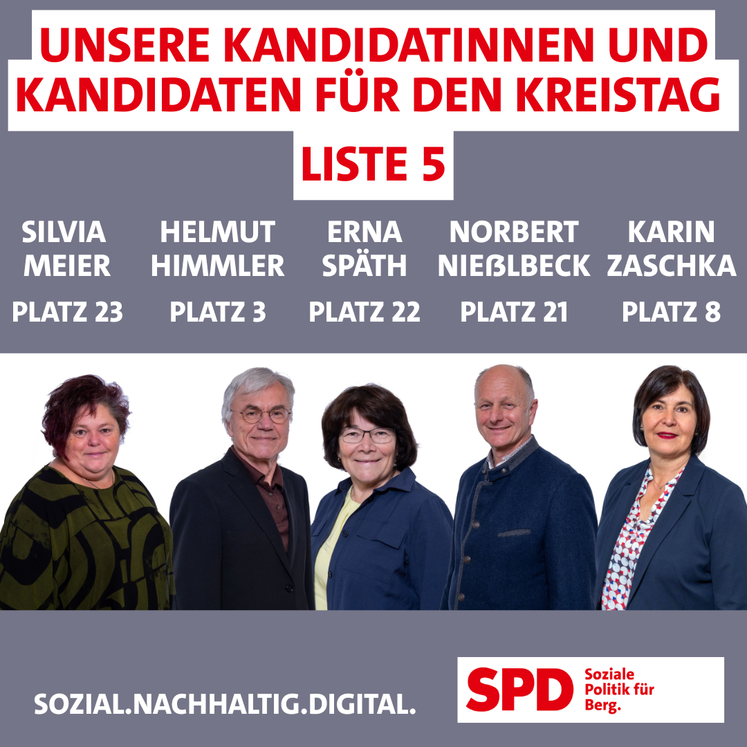 Für die SPD treten bei der Kreistagswahl fünf Kandidatinnen und Kandidaten aus Berg auf Liste 5 an. Sie stehen für eine Politik, die zuhört, Verantwortung übernimmt und die Zukunft unserer Region aktiv gestaltet.